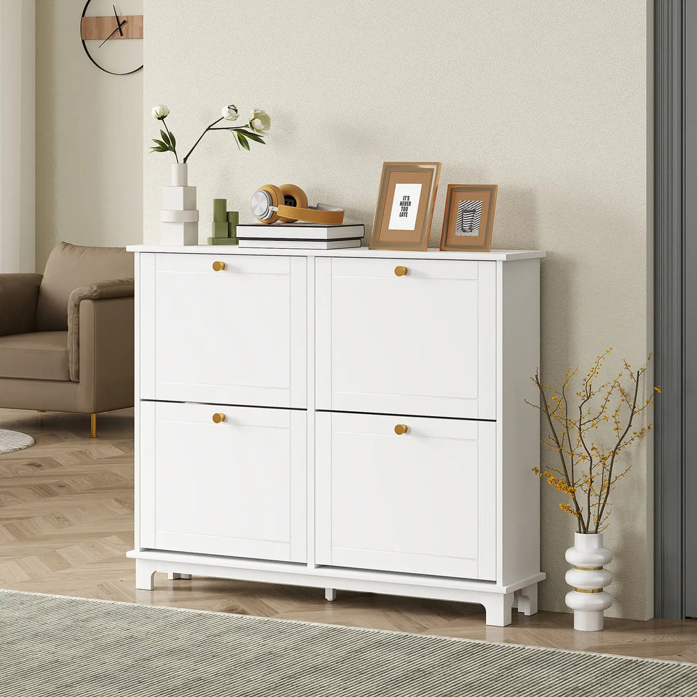 - Spacious storage: Equipped with four flip drawers, this shoe storage unit can hold up to 16 pairs of shoes, each with a 2-level adjustable shelf for easy organization. Flat top displays small decorations or stores go-out essentials