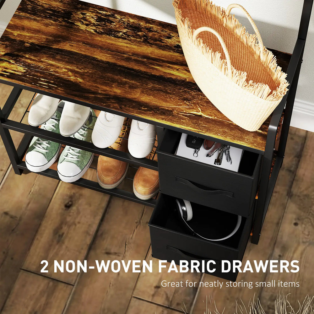 The number one spot in your hallway with this HOMCOM hall tree - an effortless blend of 15 coat hooks, a bench, two shoe racks and two removable fabric drawers - keep coats, shoes, accessories and more in one spot. It comes in an industrial style design: bold and striking - this will bring plenty of character into your home. Comes with anti-tipping straps to securely fix to a wall.