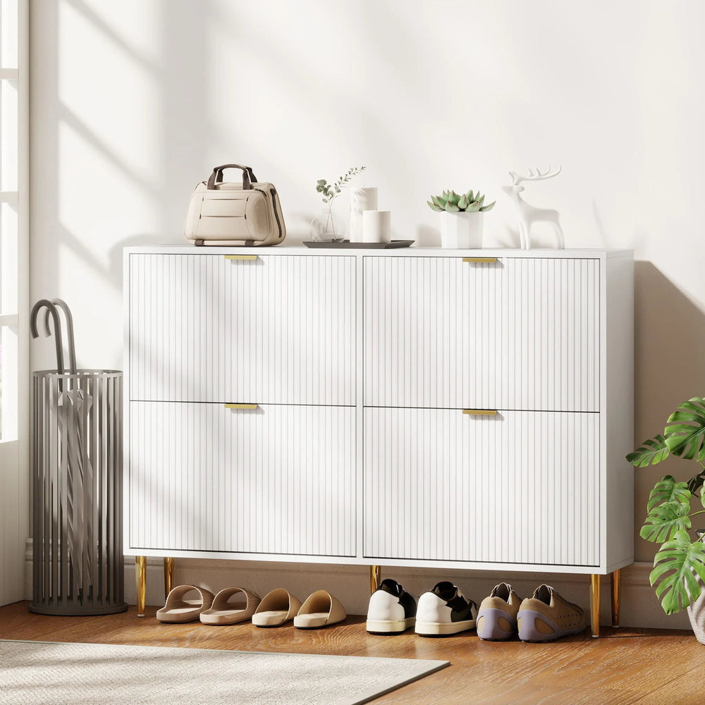 - Elegant design: A simple boxy shape in a clean colour finish - featuring ridged front door panels and gold coloured accents. The shoe storage cabinet is a beautiful piece to bring into your home