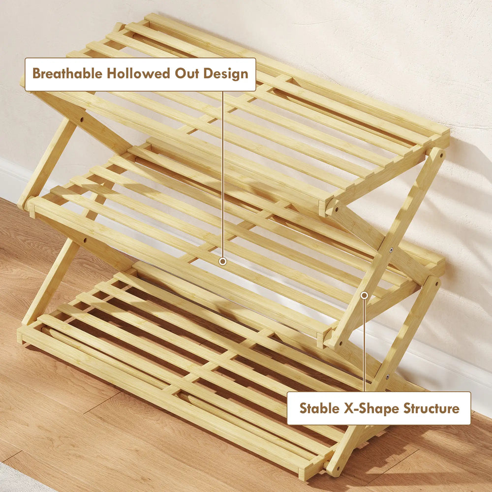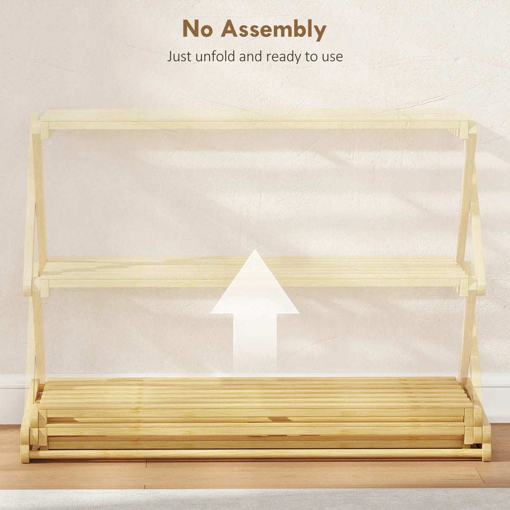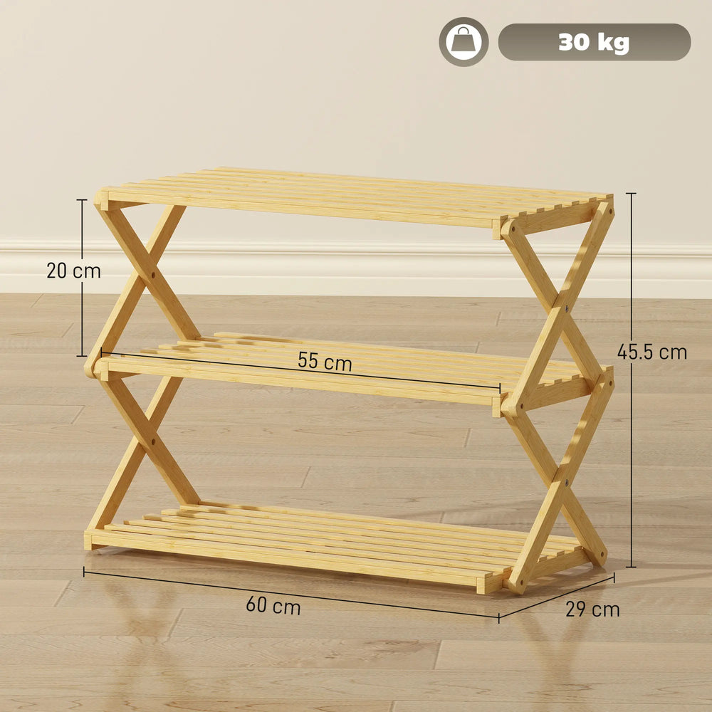 Unfold and organise footwear with our HOMCOM bamboo shoe rack. With three shelves, holding up to nine shoe pairs, there is plenty of room for boots, trainers, heels and more. Made from bamboo, this is a strong and beautiful piece, finished with a clear varnish coat for gentle protection.