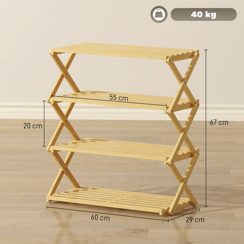 Unfold and organise footwear with our HOMCOM bamboo shoe rack. With four shelves, holding up to 12 shoe pairs, there is plenty of room for boots, trainers, heels and more. Made from bamboo, this is a strong and beautiful piece, finished with a clear varnish coat for gentle protection.