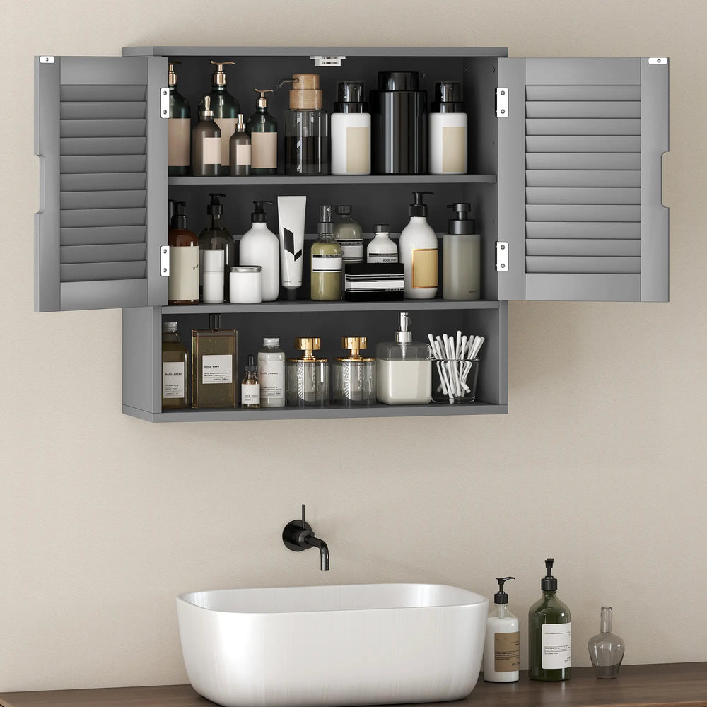 - Stylish grey finish and louvered door elevate your bathroom decor