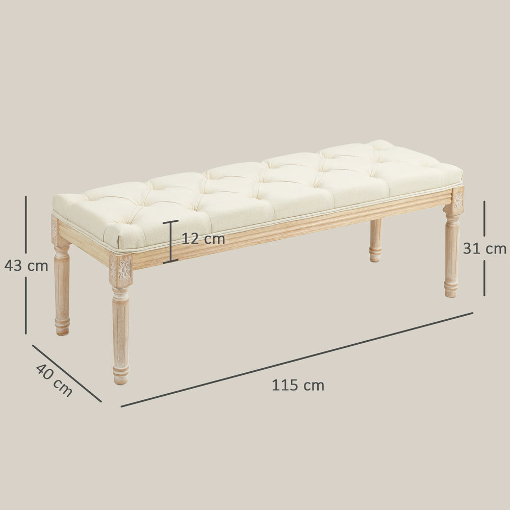 A comfortable spot, wherever you wish with this HOMCOM bed end bench. Pairing a button tufted top seat and distressed frame, it adds a vintage touch to your bedroom, hallway, window and other living spaces you choose to place it. Thanks to the wooden frame, the core is strong and supports when you sit. Window seat is complete with foot pads to gently protect floor from light marks.