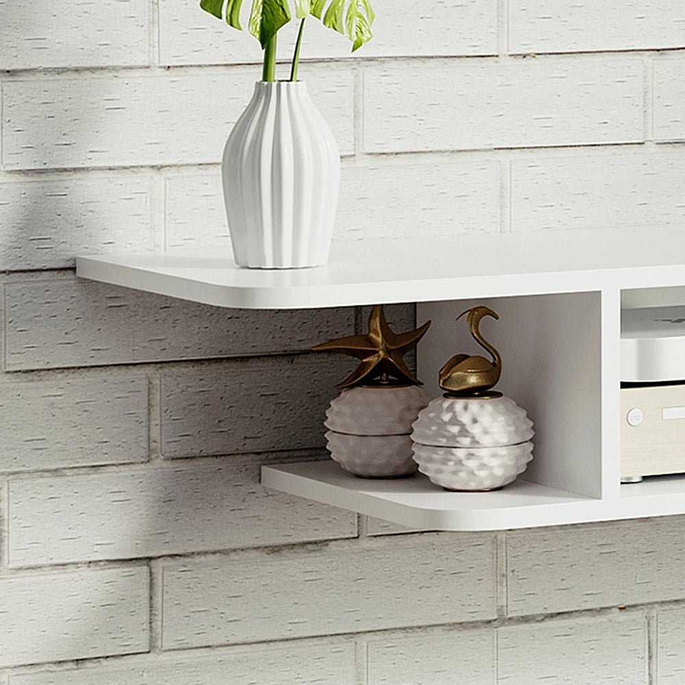 Make your space modern with this floating TV shelf, from HOMCOM. The wall-mounted design means no floor space is taken, with cable holes on the back to keep wires together and mess-free. Made from particle board, this unit is durable, with a protective melamine coating. It has a spacious middle shelf for storage; the smaller side shelves and table top offer extra display room.