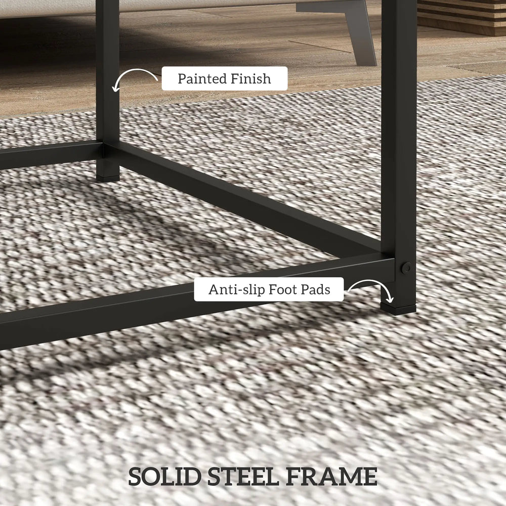 Nesting tables are done uniquely way, thanks to the coffee table set from HOMCOM adding character to your space. The coffee tables can be separated or independently used in the living room, bedroom, office. Painted steel frames and the 3.5 cm thick table top are strong structure design, which is smooth and easy to clean, can supporting the table tops properly. Let these two stylish and functional living room tables accompany you to spend every leisure moment.