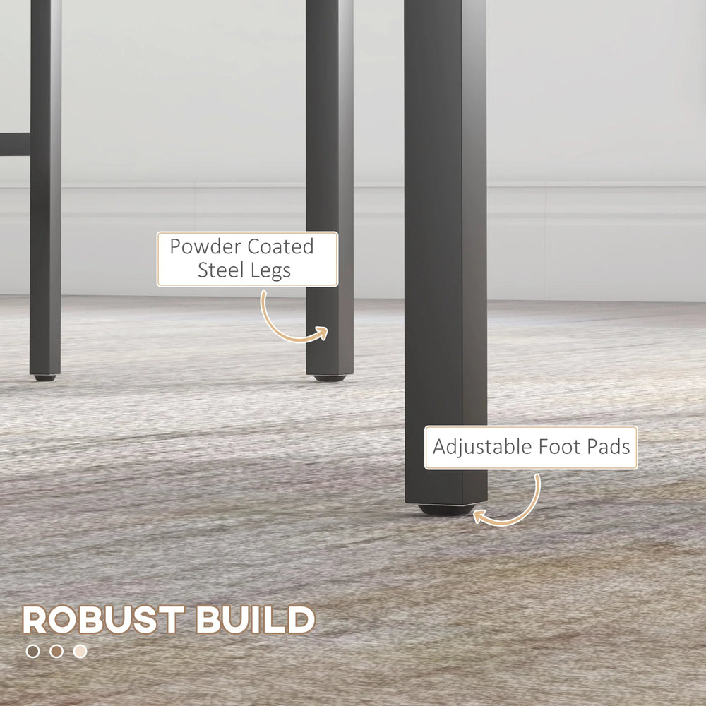 A forever-stylish focal point for family dinners and more with this HOMCOM dining table set. Powder coated steel frames for strong cores, fitted with durable particle board tops. The wood-effect is classic and looks greats in a wealth of home interiors. The dining room set comes with a rectangular dining table, two-seater bench and two chairs. Complete with a small shelf underneath the bench seat.