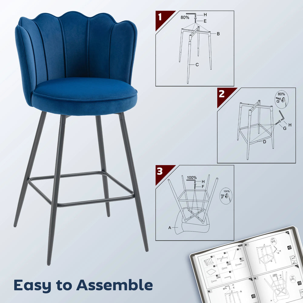 HOMCOM Set of Two Velvet-Feel Lotus Bar Stools - Dark Blue