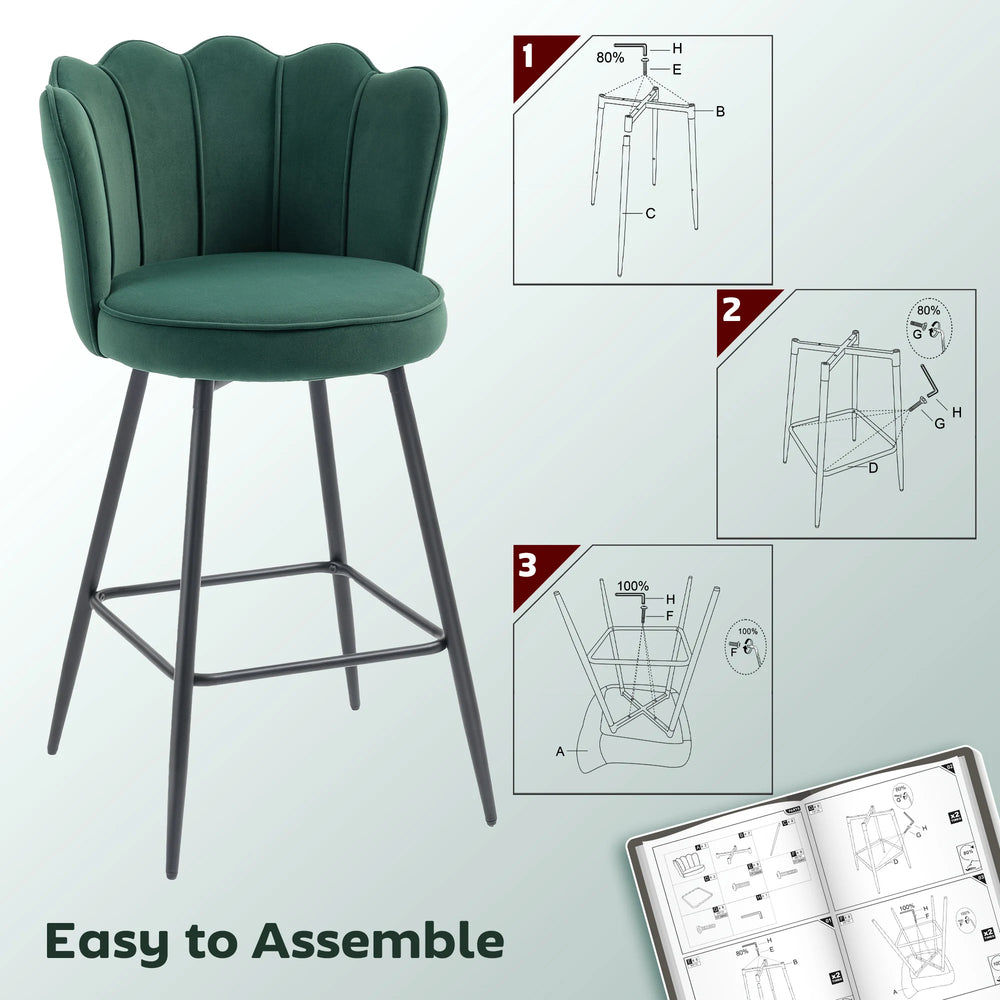 HOMCOM Set of Two Velvet-Feel Lotus Bar Stools - Dark Green