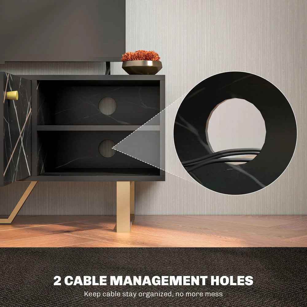 - Minimalist style: An excellent TV table serves its purpose and looks good at the same time. This TV unit with a black marble pattern and gold tone legs achieves both and even pairs well with other furniture styles. Wondering how many inches of TV it can hold? Up to 50 inches.