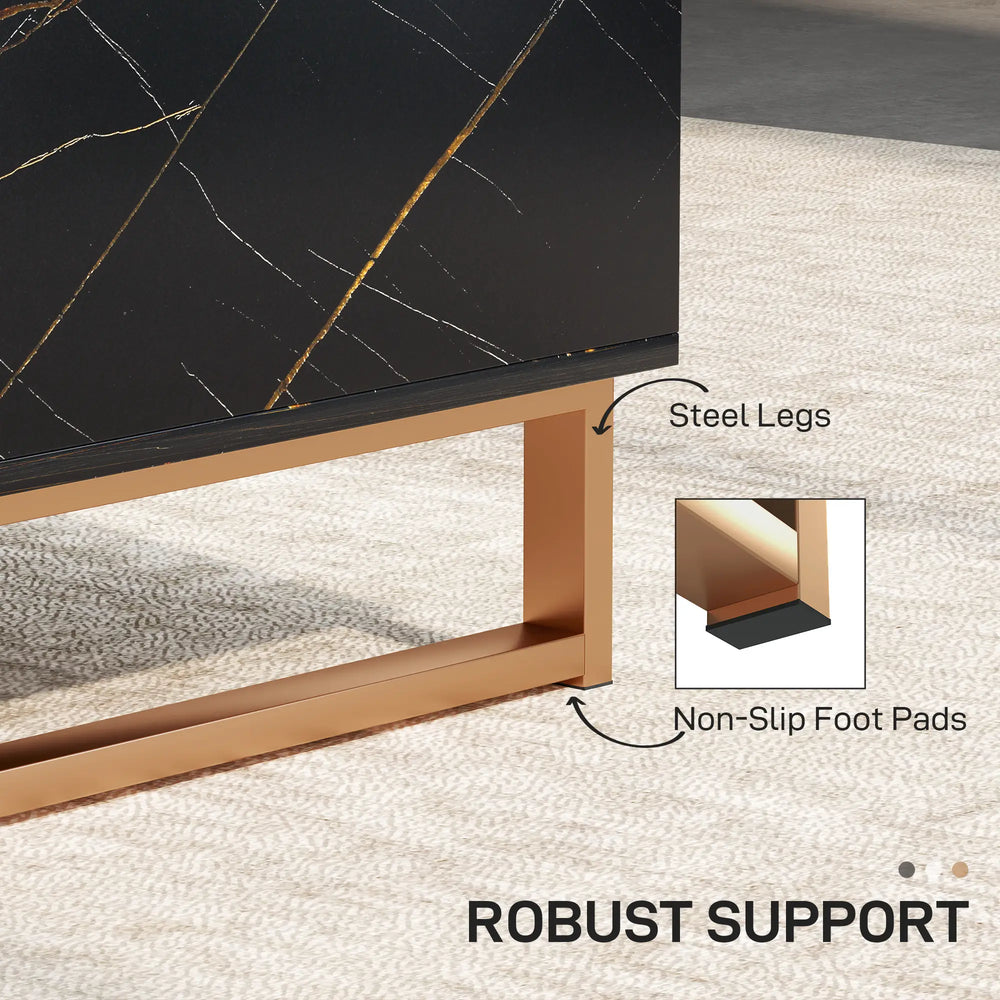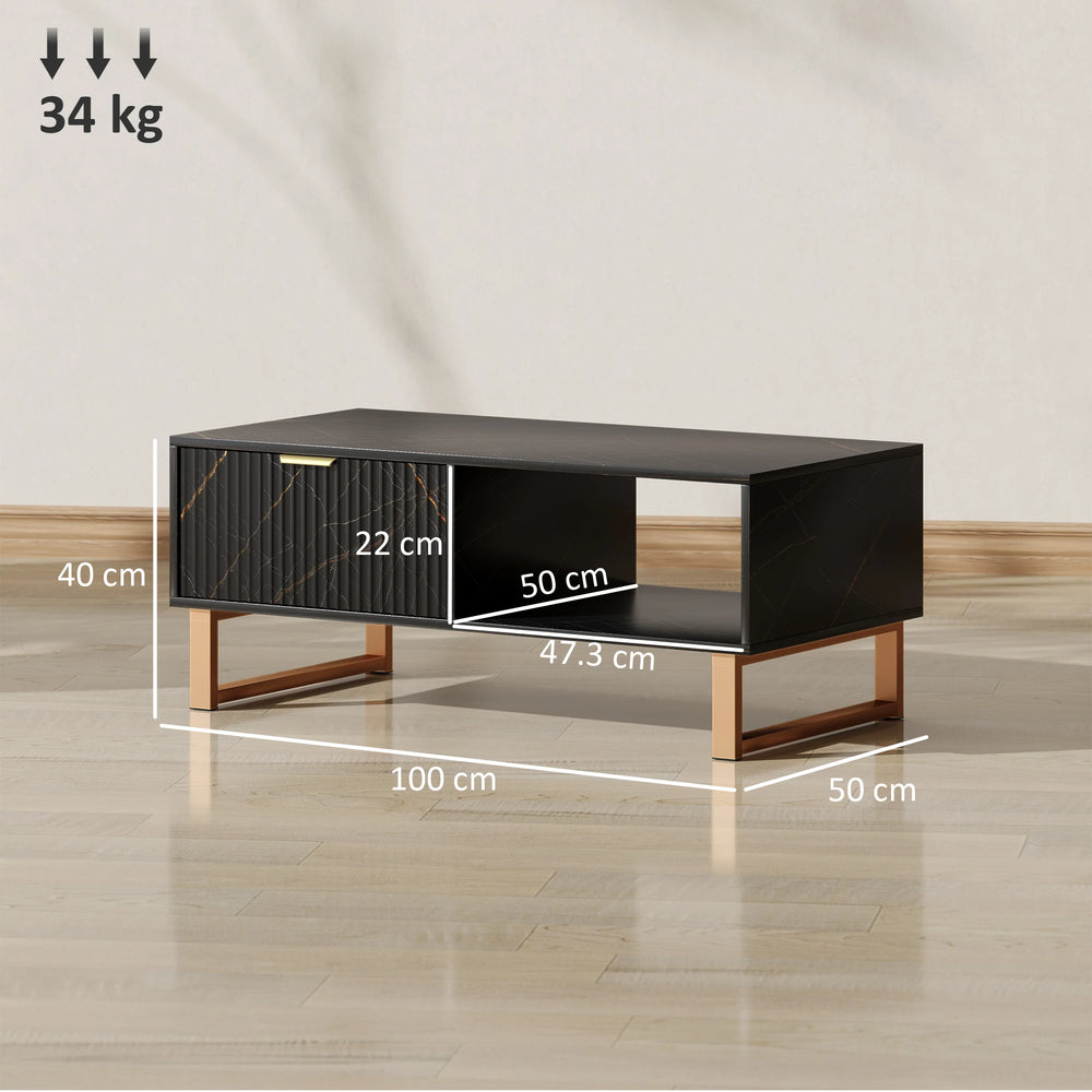 Thanks to the marble-inspired design of this HOMCOM living room coffee table, paired with the gold tone accents, this is an elegant piece for your living space. The modern coffee table has a drawer and large shelf, with a smaller shelf on the other side; complete with steel legs for lots of support.