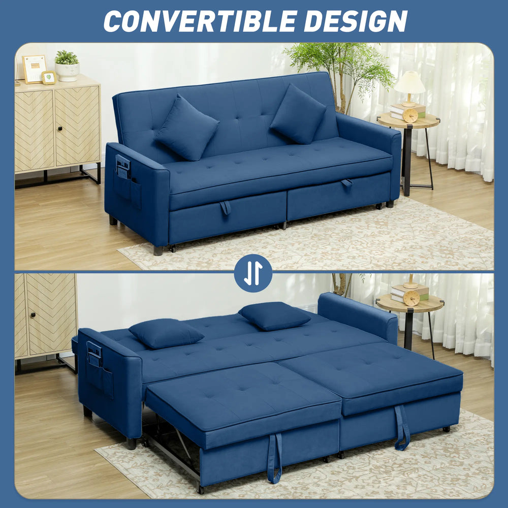 HOMCOM Three-Person Velvet-Feel Sofa Bed - Blue