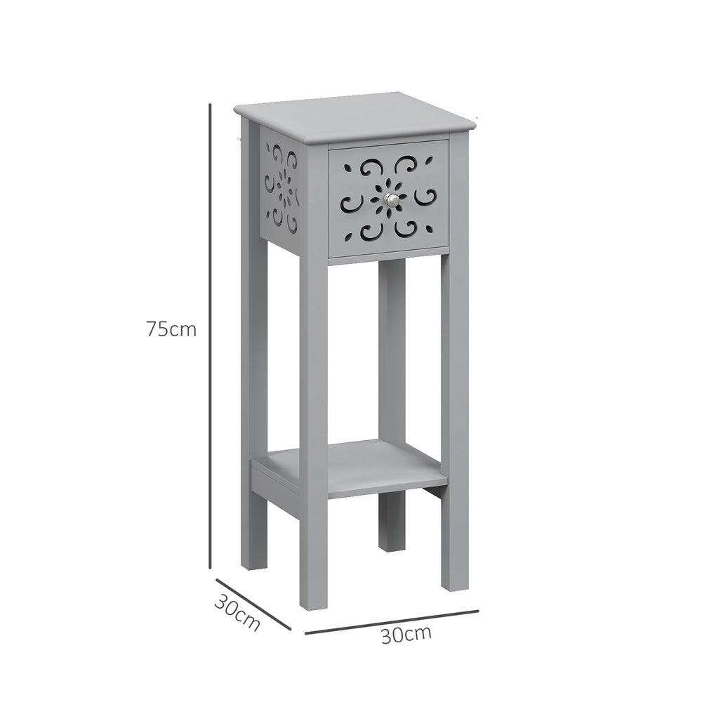 Bring the beauty of floral into the everyday, with these two HOMCOM side tables. In grey, with a floral shaped cut-out on the top, both small side tables are elegant. They features a drawer, bottom shelf and flat top to hold plenty close to you. Complete with anti-tipping straps to safely fix to a wall.