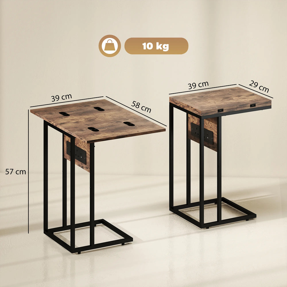 HOMCOM C Shaped Side Table with Charging Station and Foldable Top - Rustic Brown
