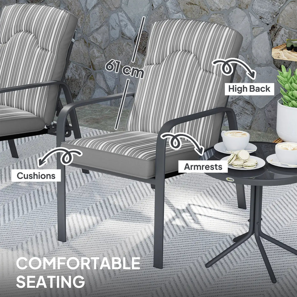This Outsunny three-piece ensemble comes with two reclining chairs, with a tempered glass-top table. Both chair back are adjustable to five adjustable positions - pick the angle you want. All frames are made from powder-coated metal for plenty of strong support. Complete with padded seat and back cushions for comfort.