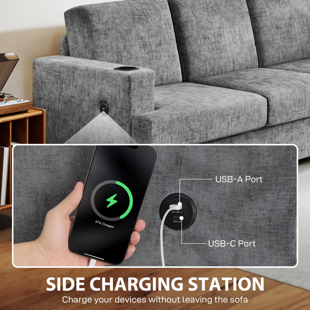 - USB ports and cupholders: This sofa keeps your devices powered up with both USB-A and USB-C ports, plus two cupholders right where you need them
