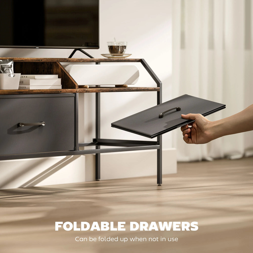 - Spacious & versatile storage: Features 2 deep foldable fabric drawers, 2 open compartments and 5 side pockets - great for organising router, books, media devices, remote controls and everyday essentials all in a stylish tv cabinet.