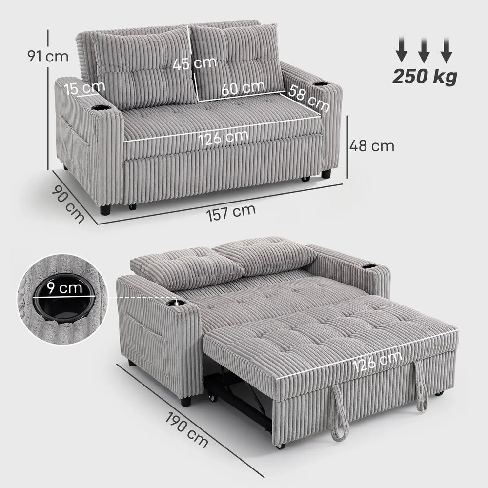 HOMCOM 2 Seater Click Clack Sofa Bed with Pull Out Design, Corduroy Upholstery - Light Grey