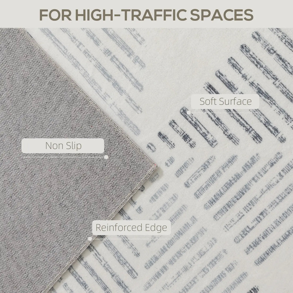 After a long day, sink your feet into the plush HOMCOM area rug, made from 100% polyester. The soothing contrast of tones and geometric lines transforms any room into a modern sanctuary. With its machine-washable design, cleaning is effortless, keeping your home beautiful with ease. Enjoy a great balance of comfort and style with this versatile rug.
