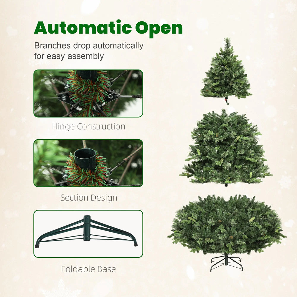 - Lifelike pine: Inspired by Carolina pine, featuring 2123 leaves and needles (some of them mimic natural branches) with 50 natural pine cones, frosted green flocking, this LED Christmas tree offers a lush, realistic look for a festive atmosphere