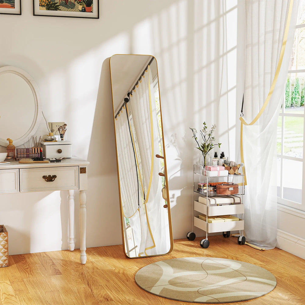Discover your full reflection with the HOMCOM floor length mirror. Designed to tilt and available as a lean-against-wall or free-standing unit with a bracket, it's great for any space needing a touch of style. This large mirror's curved corners and elegant gold-tone frame enhance any bedroom or dressing area, while the shatterproof high-definition glass ensures safety and clarity.