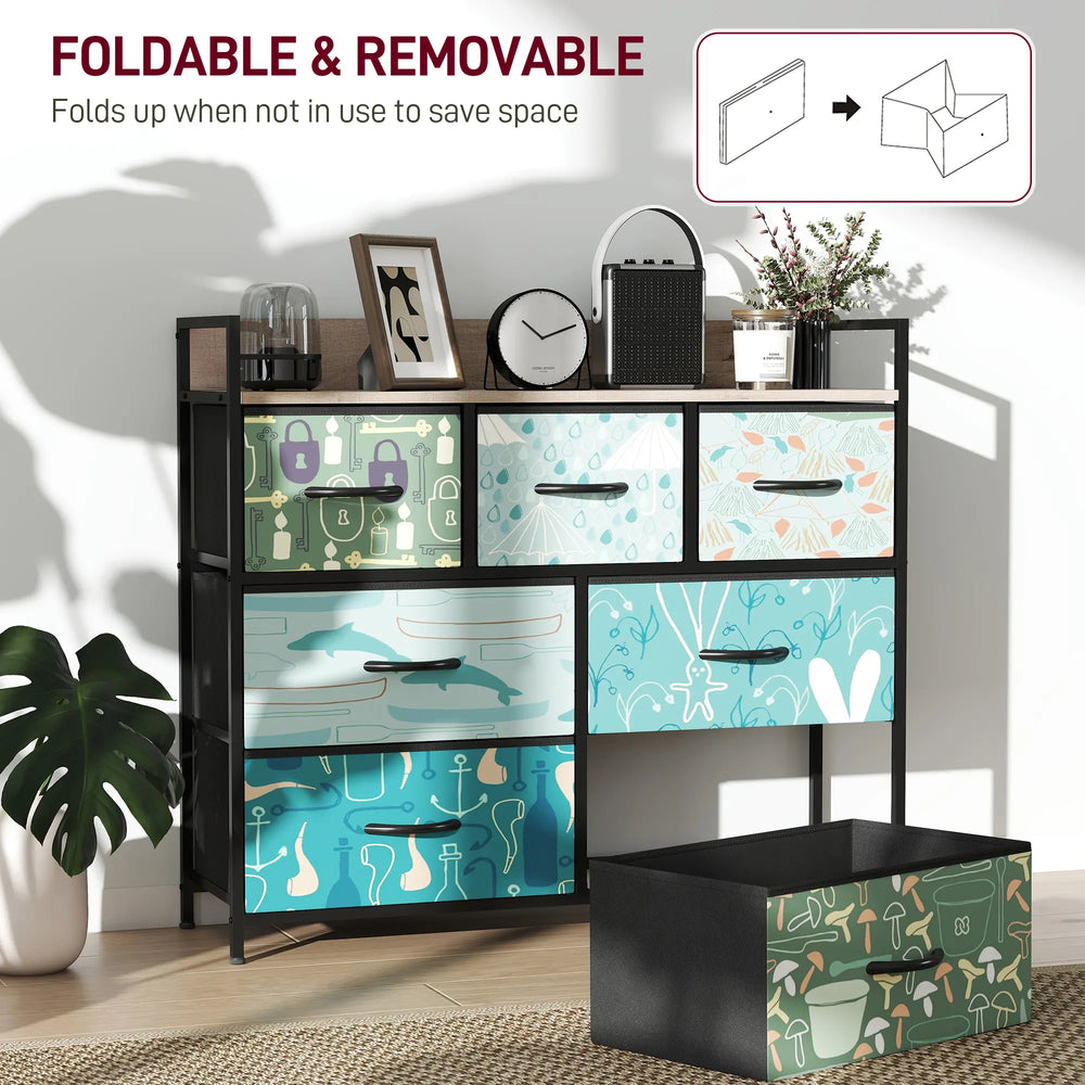 Transform your space with the HOMCOM chest of drawers, where style meets functionality! Adorned with exquisite patterns on each drawer panel, this bedroom drawers add a touch of elegance to any room. With seven fabric drawers that are both removable and foldable, organising has never been easier. Great for bedrooms, living rooms, or home offices to keep your essentials tidy.