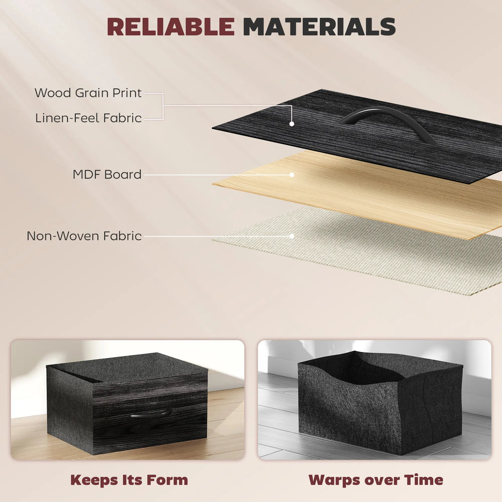 Easy, simple storage with this HOMCOM fabric chest of drawers. With four same drawers, it's easy to sort everything from socks to pants. It also features four side pockets and two hooks to get smaller accessories altogether. A steel frame with X-bars keeps this bedroom dresser stable, finished with adjustable feet for balance - even on unsteady grounds.