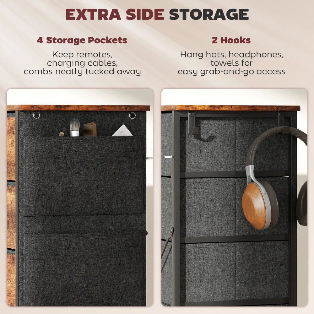 Easy, simple storage with this HOMCOM fabric chest of drawers. With three small and two large drawers, it's easy to sort everything from socks to pants. It also features four side pockets and two hooks to get smaller accessories altogether. A steel frame with X-bars keeps this bedroom dresser stable, finished with adjustable feet for balance - even on unsteady grounds.