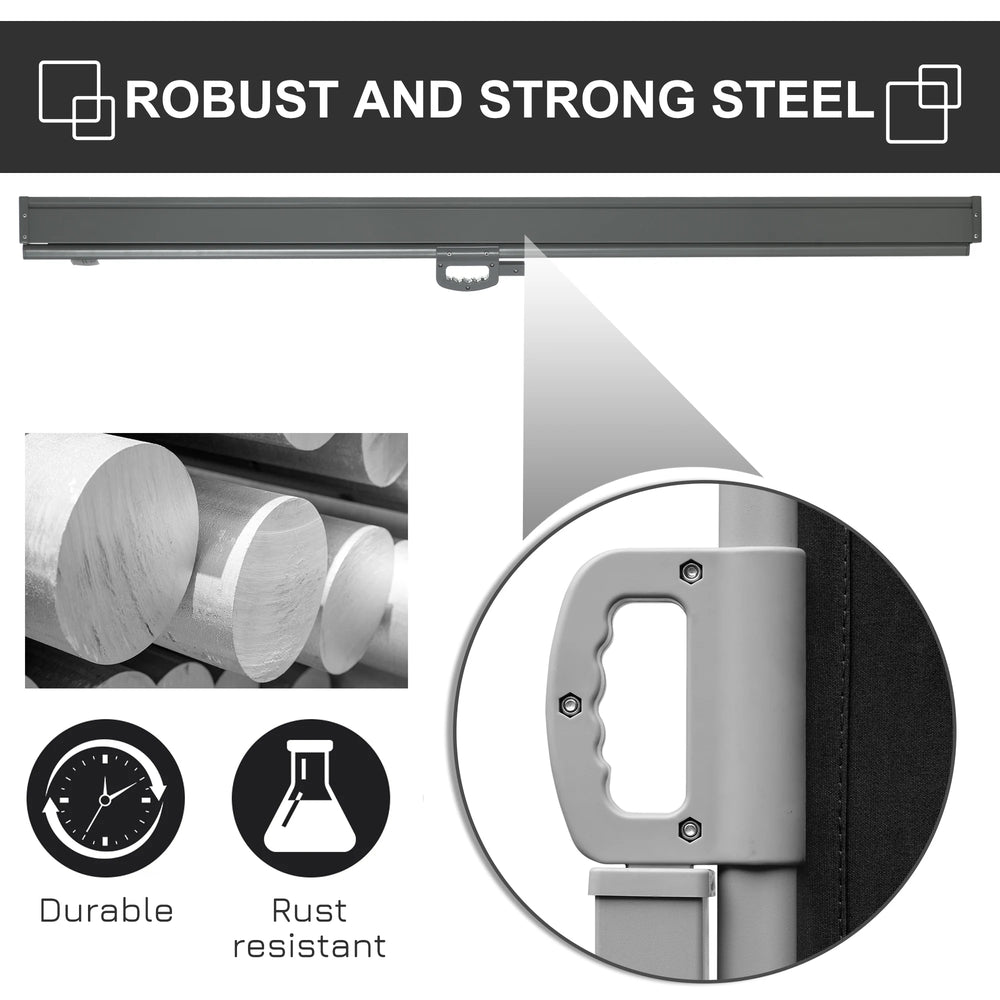 Prevent glaring sun and gusting winds disturbing you outdoors with this retractable screen from Outsunny. The metal base frame is tough to ensure it is a lasting addition in your garden, with it attaching securely and easily to cement or solid wood for quick set up. The free standing awning is made from polyester with PA coating for weather-resistance, with it pulling out smoothly and fixating in place with the clip lock handle a simple operation. A great way to enjoyably extend your time out in the garden.