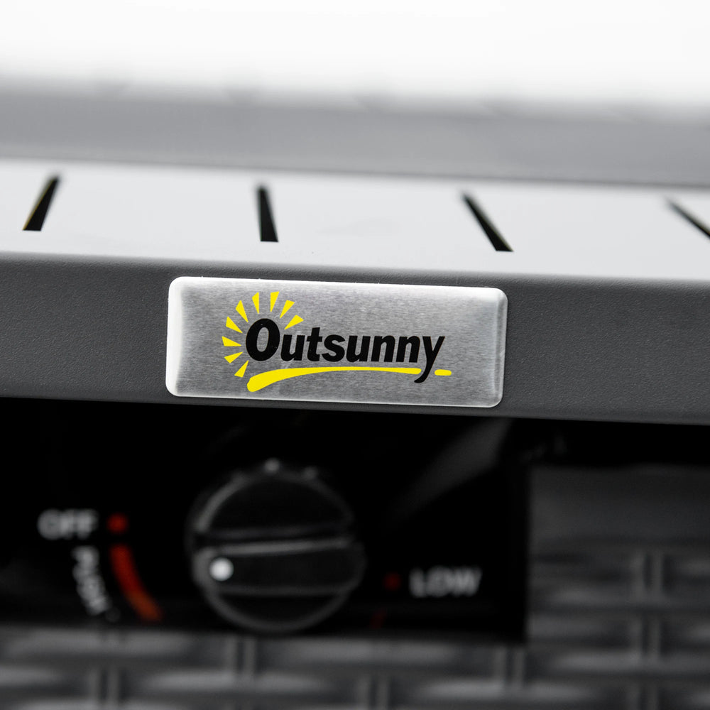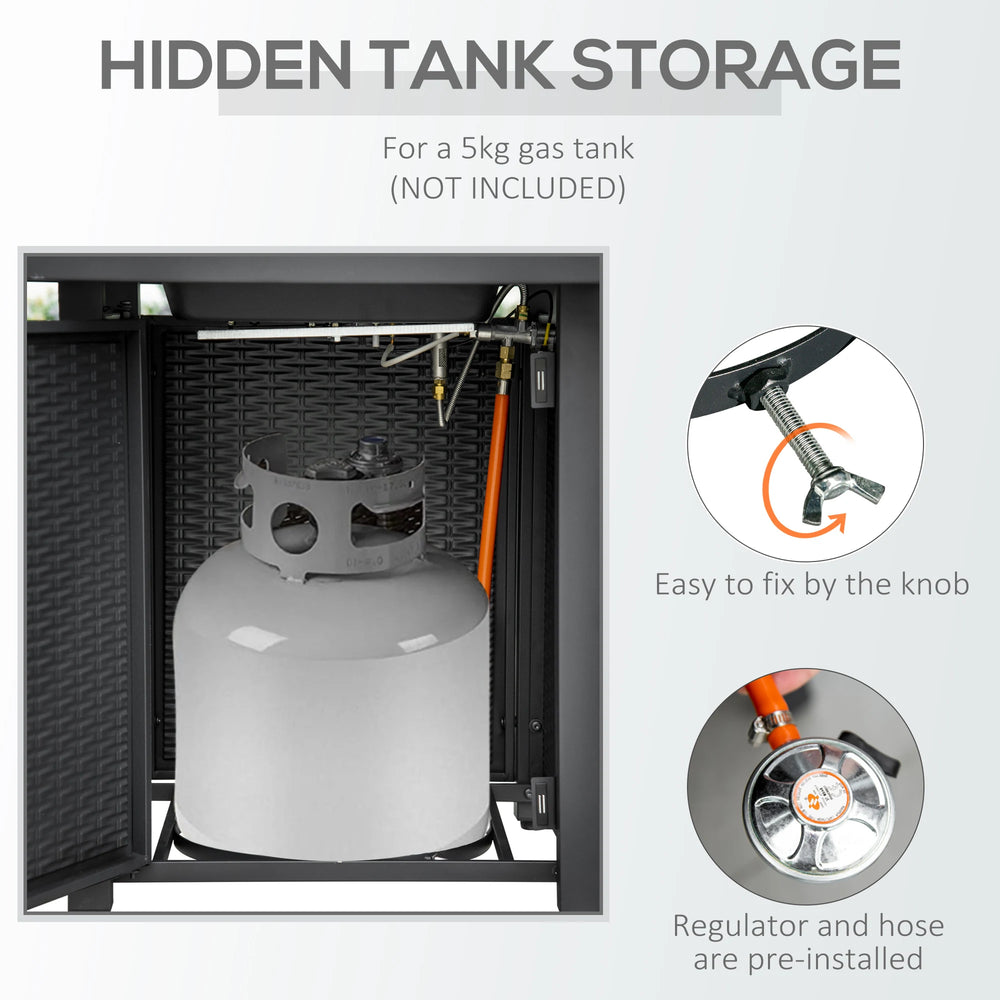 Enjoy garden warmth and ambiance all year-round with this Outsunny fire pit table. Rattan-effect design is stylish, looks great matched with other furniture. The tabletop is fitted with a centre fire pit - the 40,000 BTU burner is powerful and produces a clean smokeless burn. The flame can be adjusted too. The thermocouple closes the valve if the flame goes out for safety - no leaking gas. Complete with a mesh guard, protecting against flying sparks.