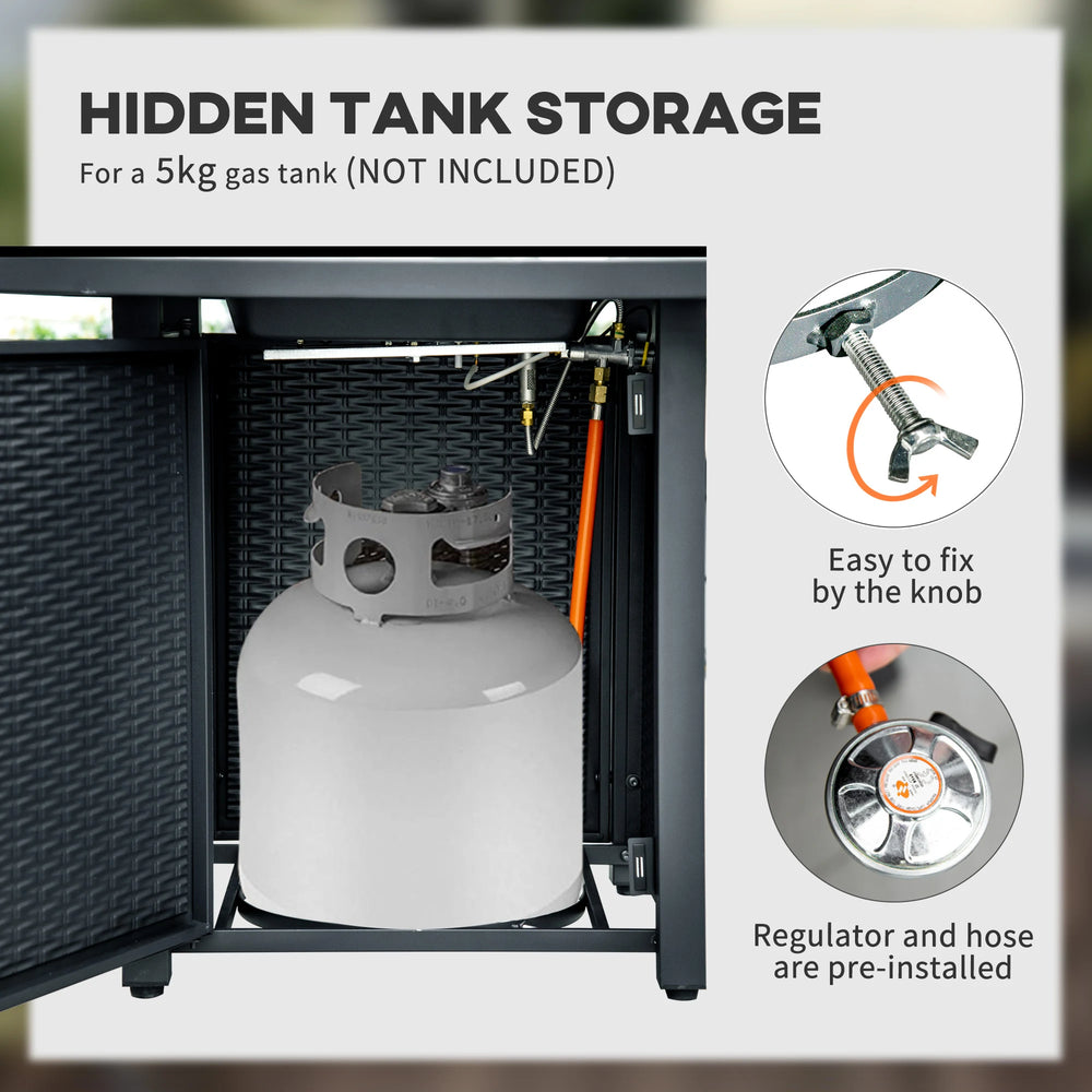 Enjoy garden warmth and ambiance all year-round with this Outsunny fire pit table. Rattan-effect design is stylish, looks great matched with other furniture. The tabletop is fitted with a centre fire pit - the 40,000 BTU burner is powerful and produces a clean smokeless burn. The flame can be adjusted too. The thermocouple closes the valve if the flame goes out for safety - no leaking gas. Complete with a mesh guard, protecting against flying sparks.