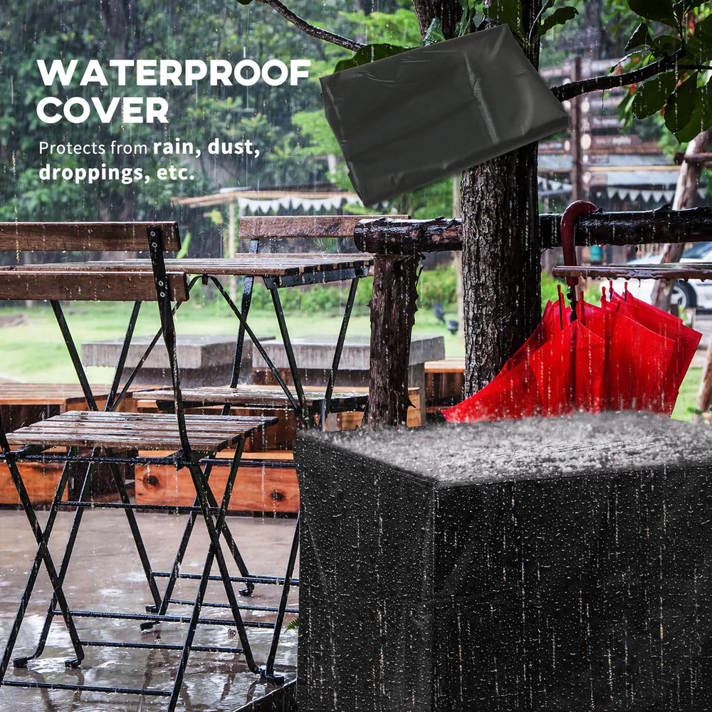 - Duo design, with rain cover: Both a fire pit and outdoor dining table - does double the job in one compact size. Lid to cover the firepit when needed as table. 5kg propane tank is required - not included. Protective sheet to table table against rain damage.