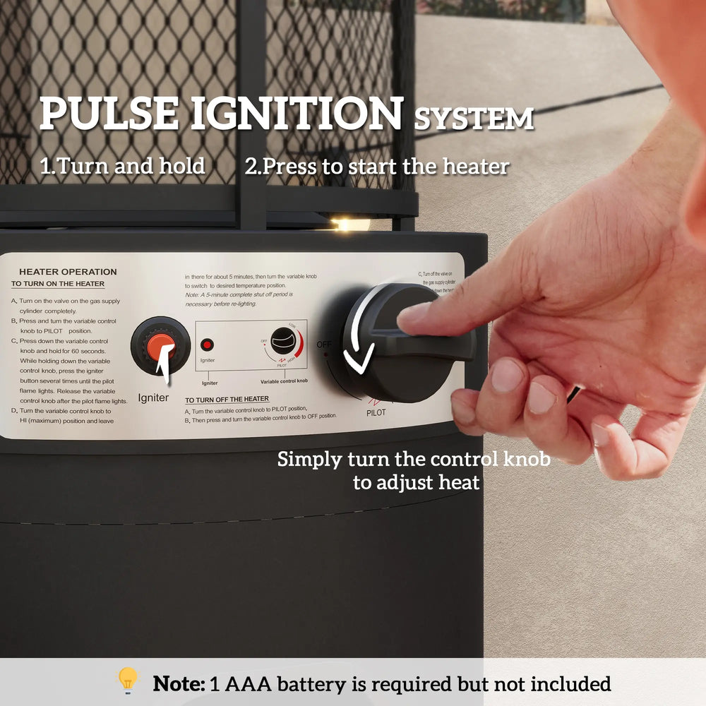 Great for the patio and other outdoor areas - this Outsunny garden heater. 11 KW powered, so you can easily adjust the heat with the knob - keep warm at a temperature you want; the pulse ignition makes it easy to light. The casing is made from metal, this outdoor propane heater is a tough piece.