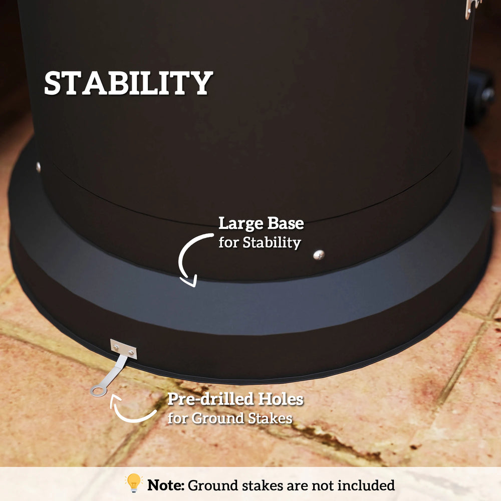 - Large base keeps it steady and balanced, pre-drilled holes to insert ground stakes to pin to ground