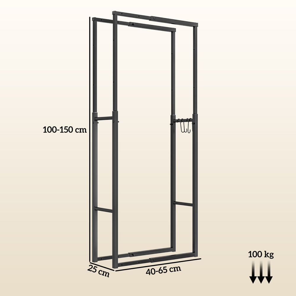 Keep firewood tidy and aerated with this Outsunny log holder. Expand this indoor and outdoor log storage rack 40-65cm in width and 100-150cm in height, catering for different loads of wood. The powder coated steel structure is strong and keeps in shape. The two racks also come with eight handy hooks to keep tools within reach.