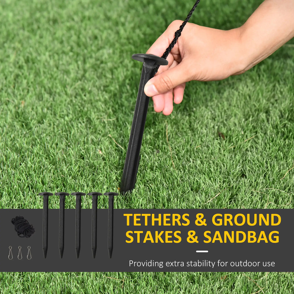 - Comes with 5 x ground stakes, 3 x guy ropes and 1 x sandbag