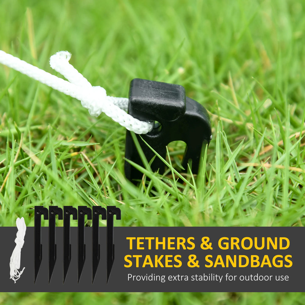 - Six ground stakes, two guy ropes and four sandbags to pin to ground, keep it weighted