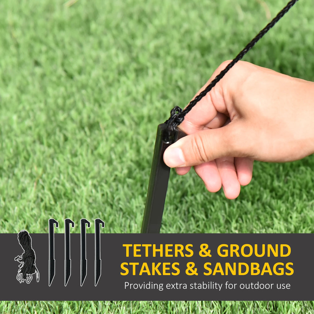 - Four ground stakes, two guy ropes and two sandbags to pin to ground, keep it weighted