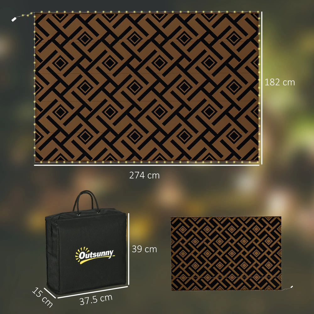 Outsunny Plastic Straw Reversible RV Outdoor Rug with LED String Light, 182 x 274cm, Brown and Black