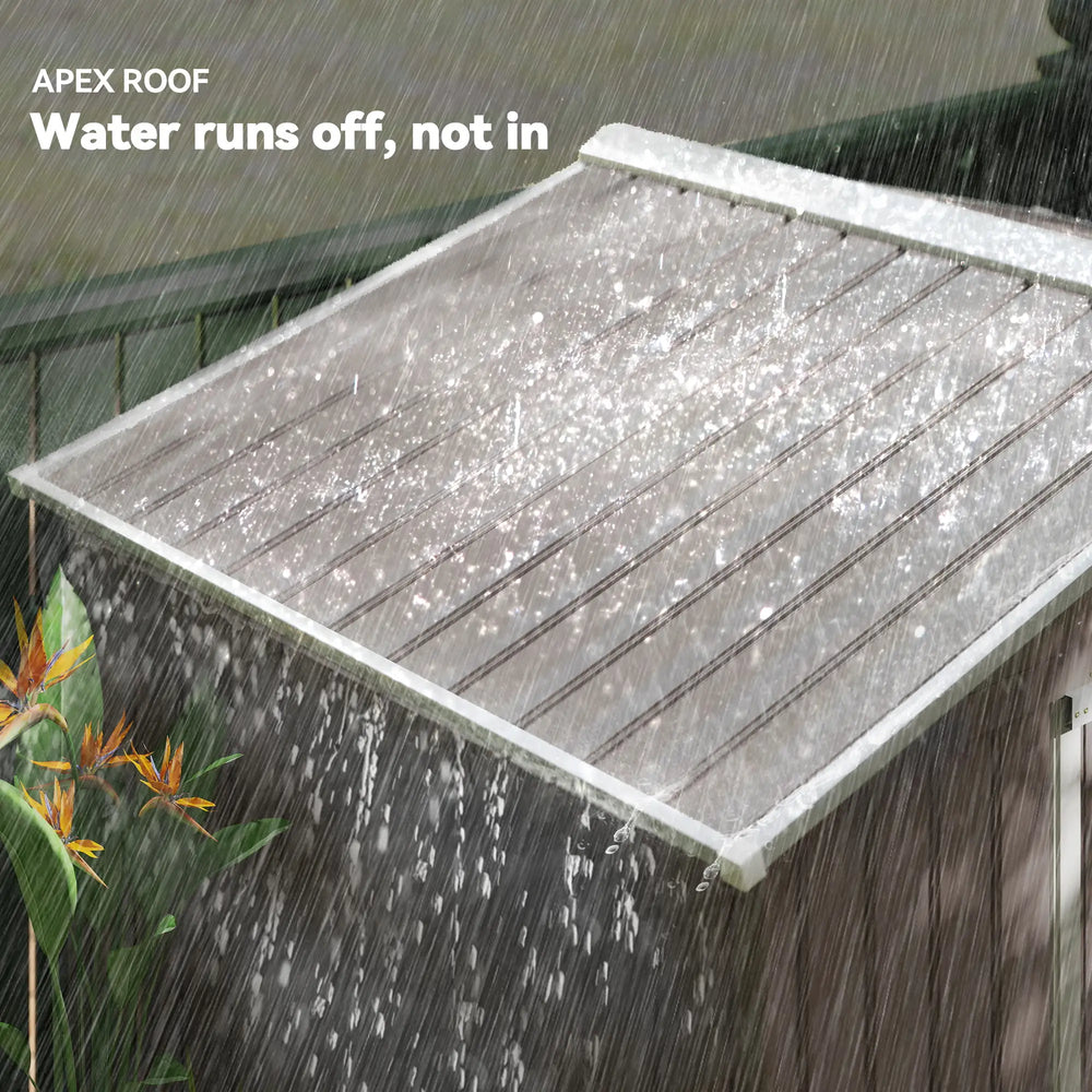 - SLOPING ROOF: Allows water to roll down to the ground, preventing build up, stagnation and rust damage.