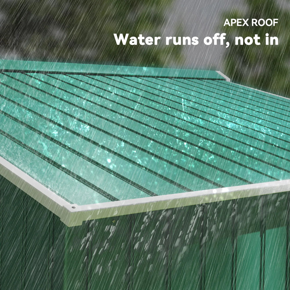 - Sloping roof: Allows water to roll down to the ground, preventing buildup, stagnation and rust damage to this metal shed. Four ventilation slots to allow air inside - helps keep it fresh.