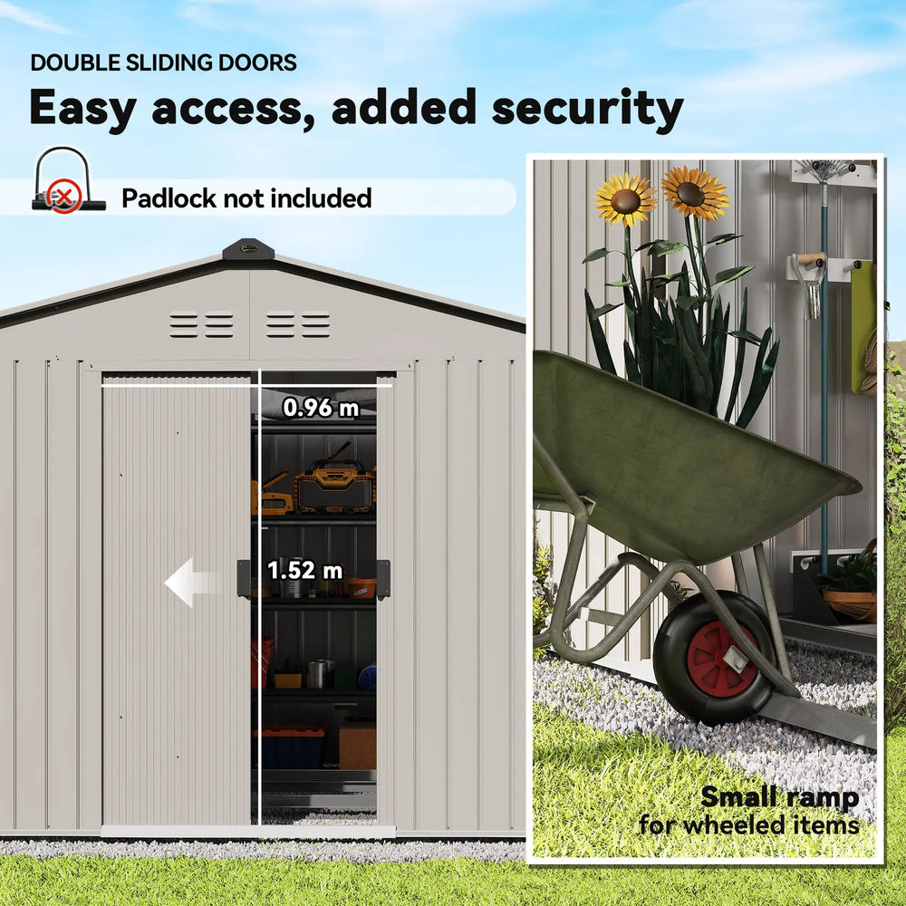 Keep your garden equipment and outdoor essentials locked away securely with this metal shed from Outsunny. Built from galvanised steel for strength, it comes with a lockable double sliding door on the front for easy access and four vents for air to circulate and prevent moisture buildup. The garden tool shed is finished with a protective weather coating and a foundation kit (FLOOR IS NOT INCLUDED).