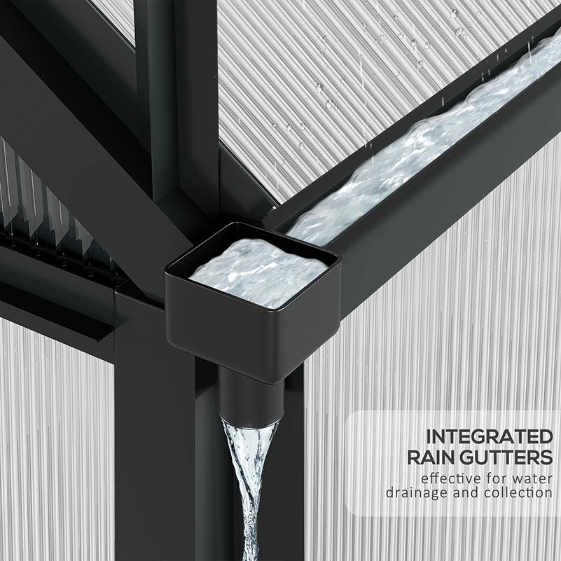 - Aluminium frame: A strong core structure for this greenhouse. Fitted with rain gutters to naturally catch water.