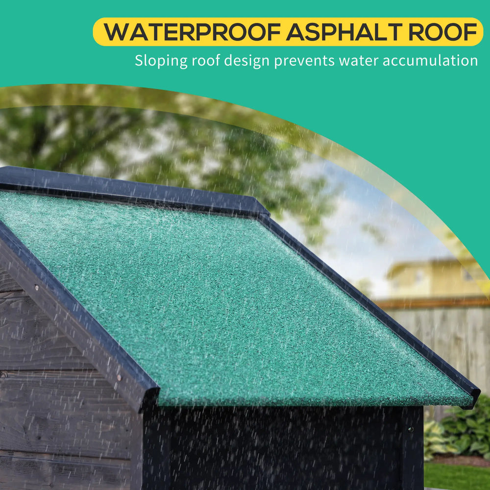 - Fir wood structure, with asphalt roof: A strong structure, with a weather-resistant paint coating - suitable for outdoor use. Sloped roof to prevent water build up, with a covering to help stop liquids seeping through.