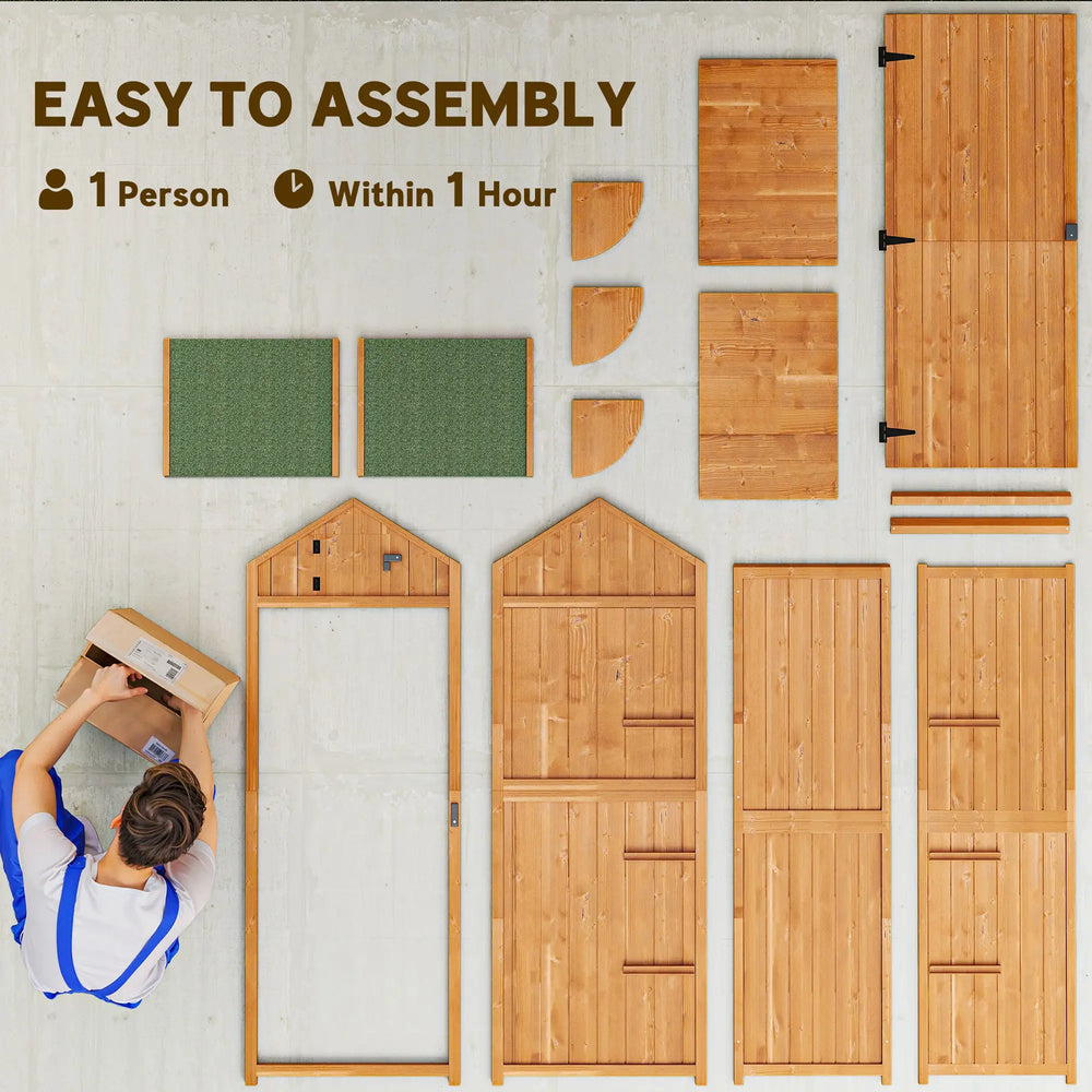 The backyard storage shed from Outsunny is an ideal solution for organizing all your garden tools and equipment. You can place small items on 3 shelves and store bigger tools in the larger area. This vertical storage shed is made of durable pine wood and cedarwood for a sturdy and strong construction. The wooden surface covered with waterproof paint and the roof with asphalt help provide added protection outdoors. The tool cabinet is designed to be an elegant and practical addition to your garden.