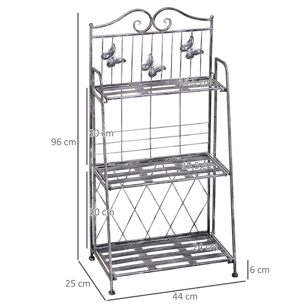 Add style and storage to your home with this charming tiered plant stand from Outsunny. This 3-tiered plant rack is built with a gorgeous sturdy metal scrollwork frame, which brings a touch of elegance to your porch, patio, interior space or wherever you want to utilize it. It is perfect for holding everything from books to decorative candles. Easy to fold down and store in the corner space when not in use. With this smart gadget, you can easily keep your surrounding area neat and tidy!