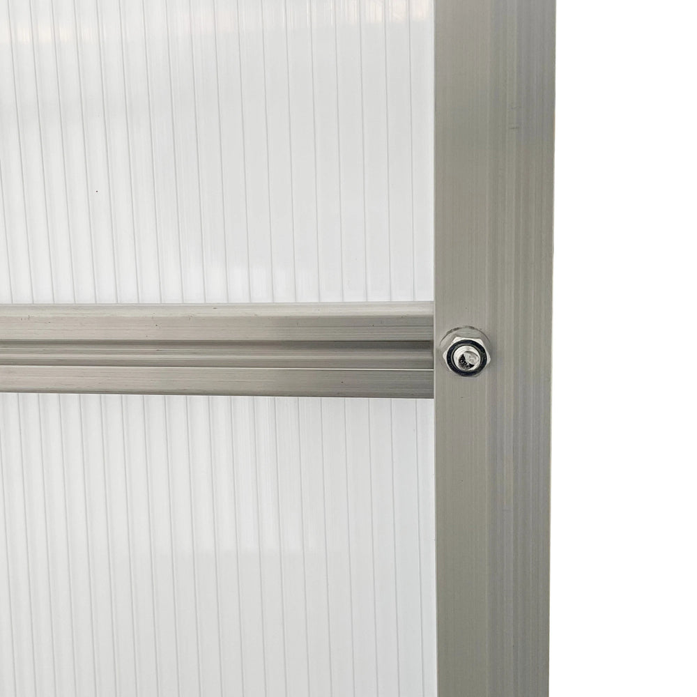 - Aluminium frame: A strong core for this polycarbonate greenhouse, keeps it in shape. Base included for balance. 4 x ground bolts included to anchor to the ground.