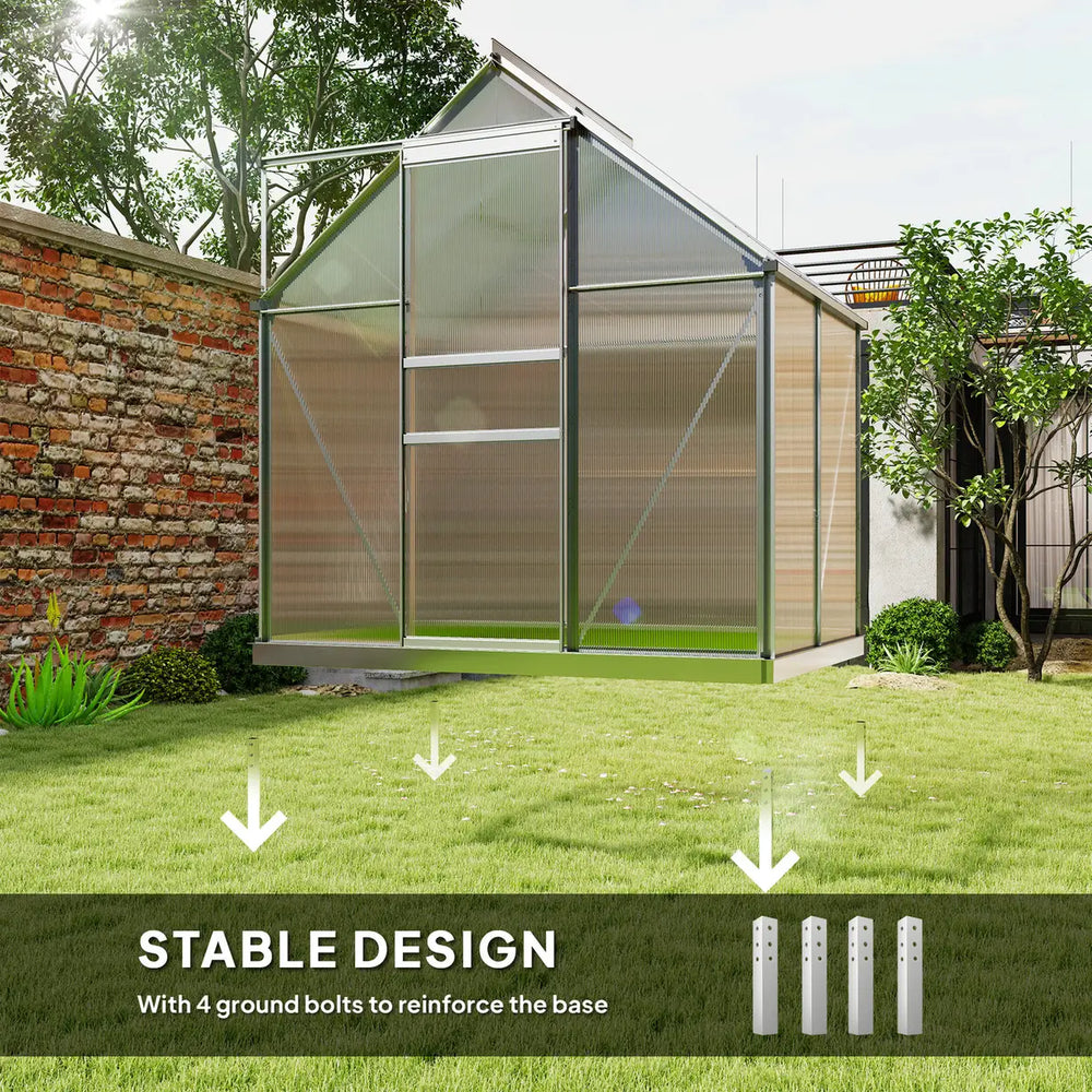 - Aluminium frame: A strong core for this polycarbonate greenhouse, keeps it in shape. Base included for balance. 4 x ground bolts included to anchor to the ground.