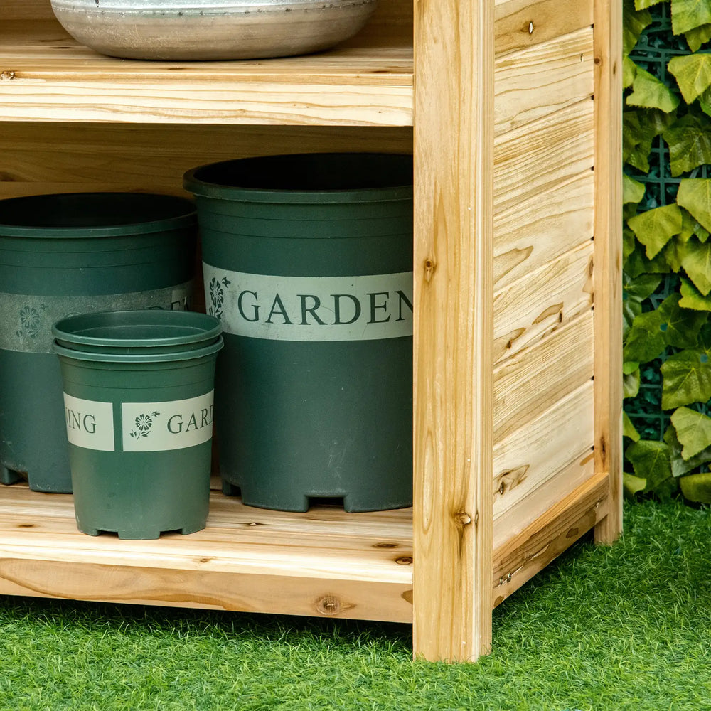 - Potting bench with storage: Comes with a small top shelf and two larger bottom shelves. Hooks below the top shelf. Plenty of room for garden essentials.