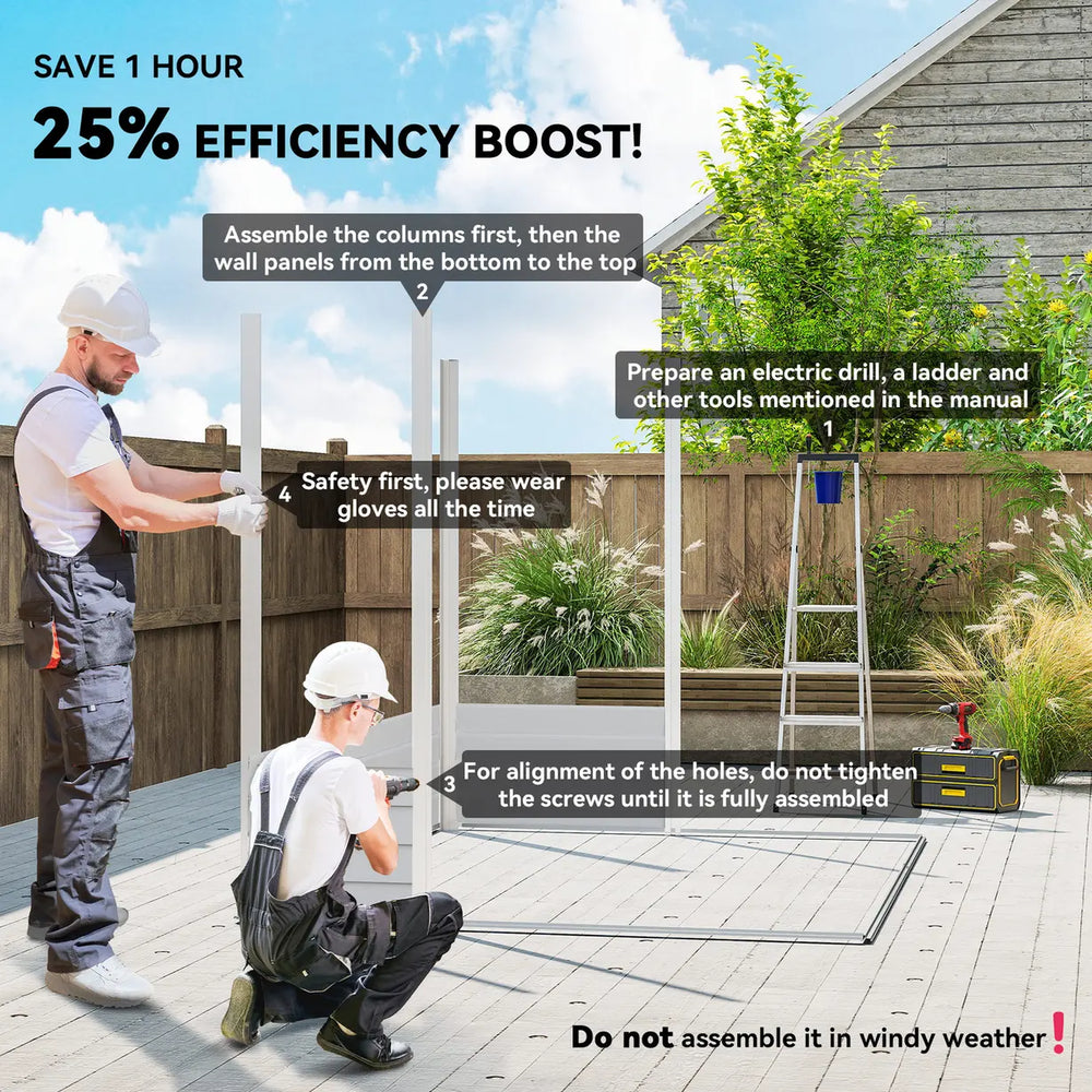 - Accessories included: Installation gloves. Dimensions: Overall: 193W x 271D x 208/175H cm, Door: 64W x 171H cm. Assembly required. Three people required for installation in approx. four hours - ALWAYS wear gloves. Do not build during windy weather conditions.