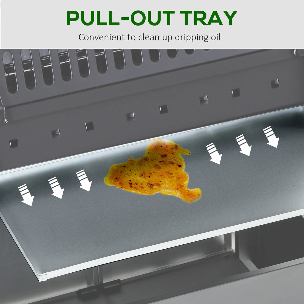The 4 + 1 portable gas bbq for camping from Outsunny features 4 stainless steel burners and a stainless steel burner, great for outdoor barbecue parties. The lid design that helps preserve all the flavours. When preparing for your party, you can put all your grilling essentials and accessories within easy reach on the side tabletop or in the lower cupboard. Add the solid and safe BBQ and enjoy your cooking outdoors with complete peace of mind.